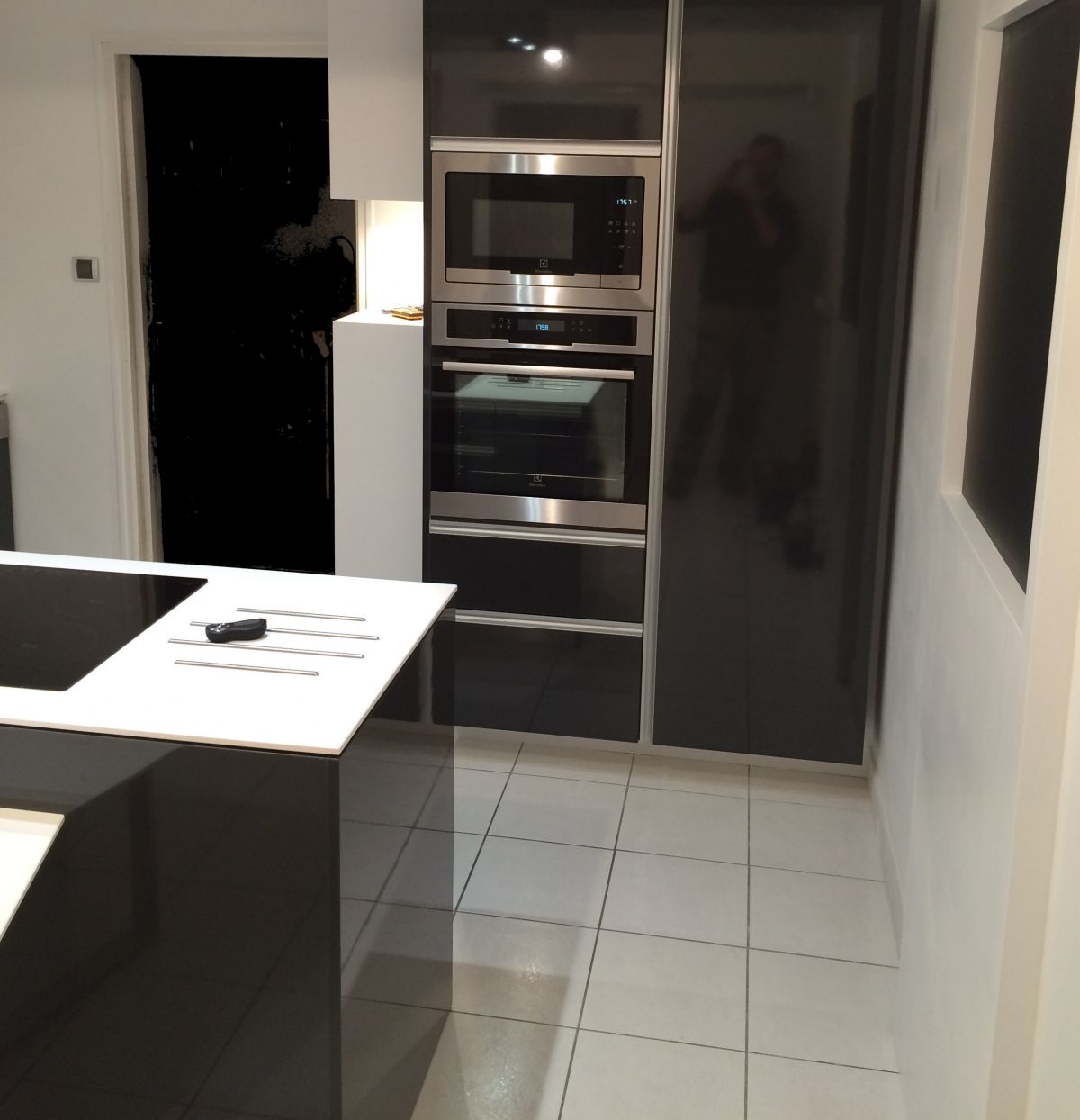 Décors stratifié brillant graphite, poignée prise de main aluminium.