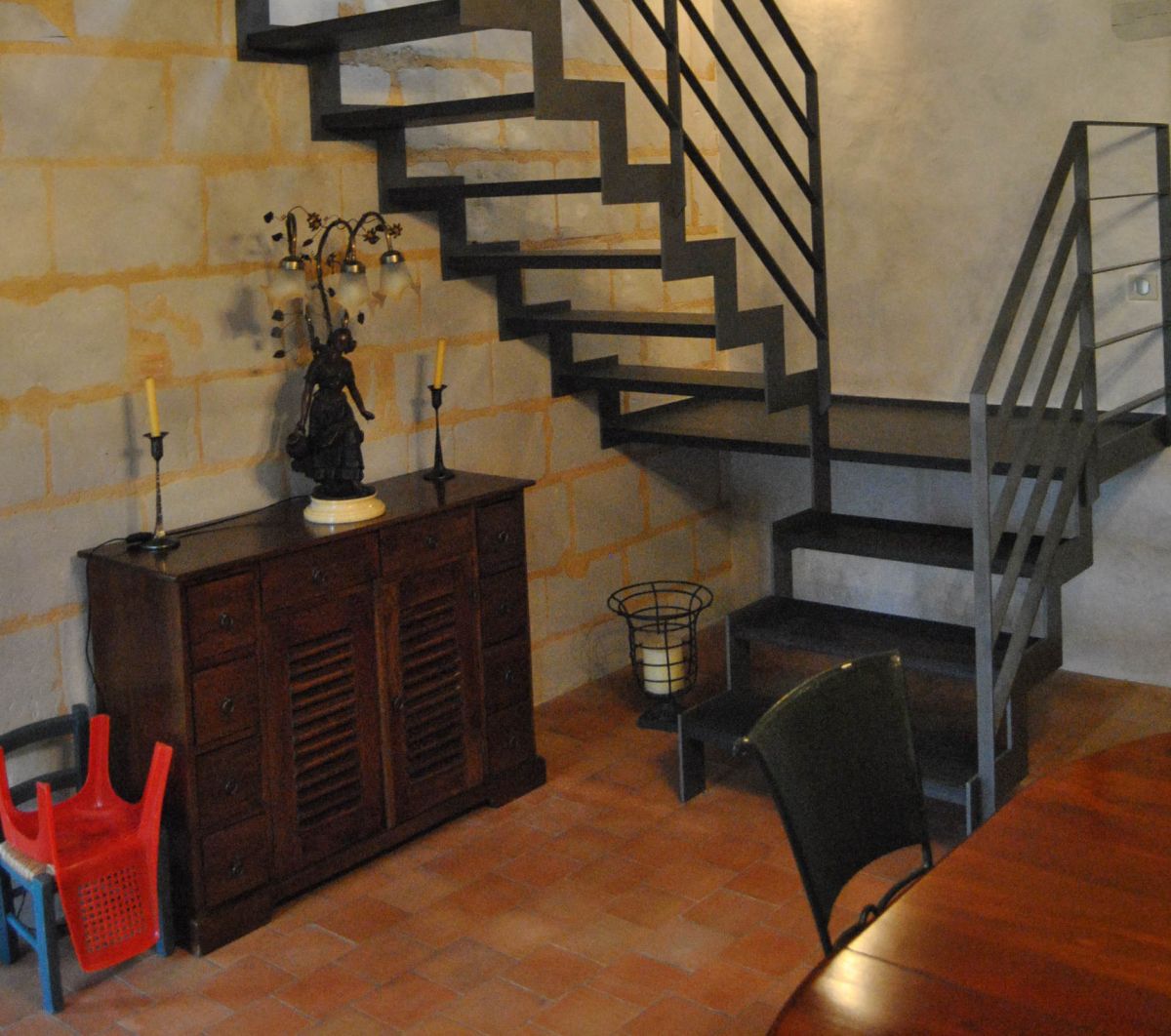 Escalier contemporain Escalier sur crémaillère métalliqueGarde de corps fer platMarche chêne teinté noire Précédent Suivant
